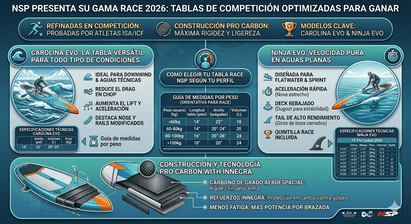 ¿Buscas las mejores tablas de paddle surf race para 2026? NSP ha lanzado su nueva gama Race, con modelos como la Carolina EVO y Ninja EVO refinados en competiciones elite como los Mundiales ISA e ICF, combinando estabilidad, velocidad y control para aguas planas, técnicas y abiertas.