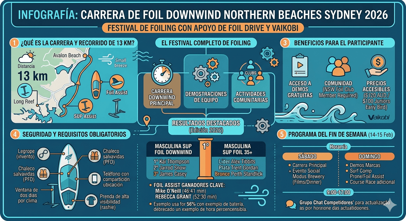 Imagina surcar 13 km de olas en las playas del norte de Sydney, desde Long Reef hasta Avalon Beach, con tu foil listo para capturar cada swell. Esa es la esencia de esta carrera, que se celebró los días 14 y 15 de febrero de 2026 en Fishermans Beach, Collaroy. Aunque el viento fue escaso, un pequeño swell del sur permitió que los competidores mantuvieran el glide y disfrutaran de condiciones desafiantes pero navegables.
