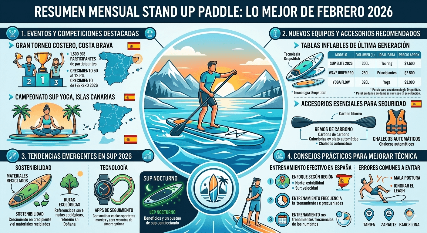En este resumen mensual del stand up paddle (SUP) de febrero 2026, descubre los eventos clave, avances en equipo y tendencias que están marcando el rumbo en este deporte acuático. Te traemos lo esencial para que estés al día y potencies tu práctica en España.