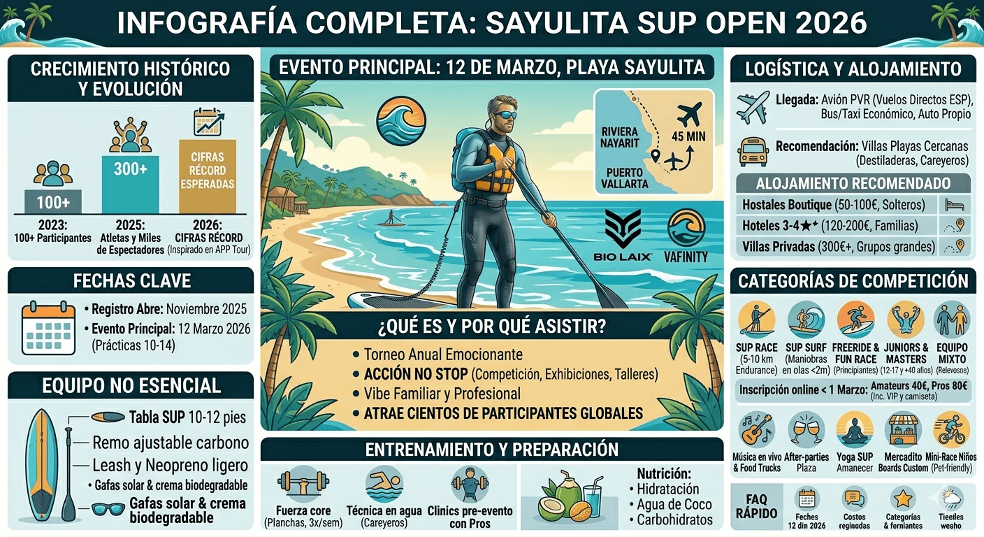 Marca tu calendario: el evento principal se celebra el 12 de marzo de 2026, con actividades previas desde el viernes. La sede es la Playa de Sayulita, un spot perfecto por sus olas consistentes y vientos suaves ideales para SUP.