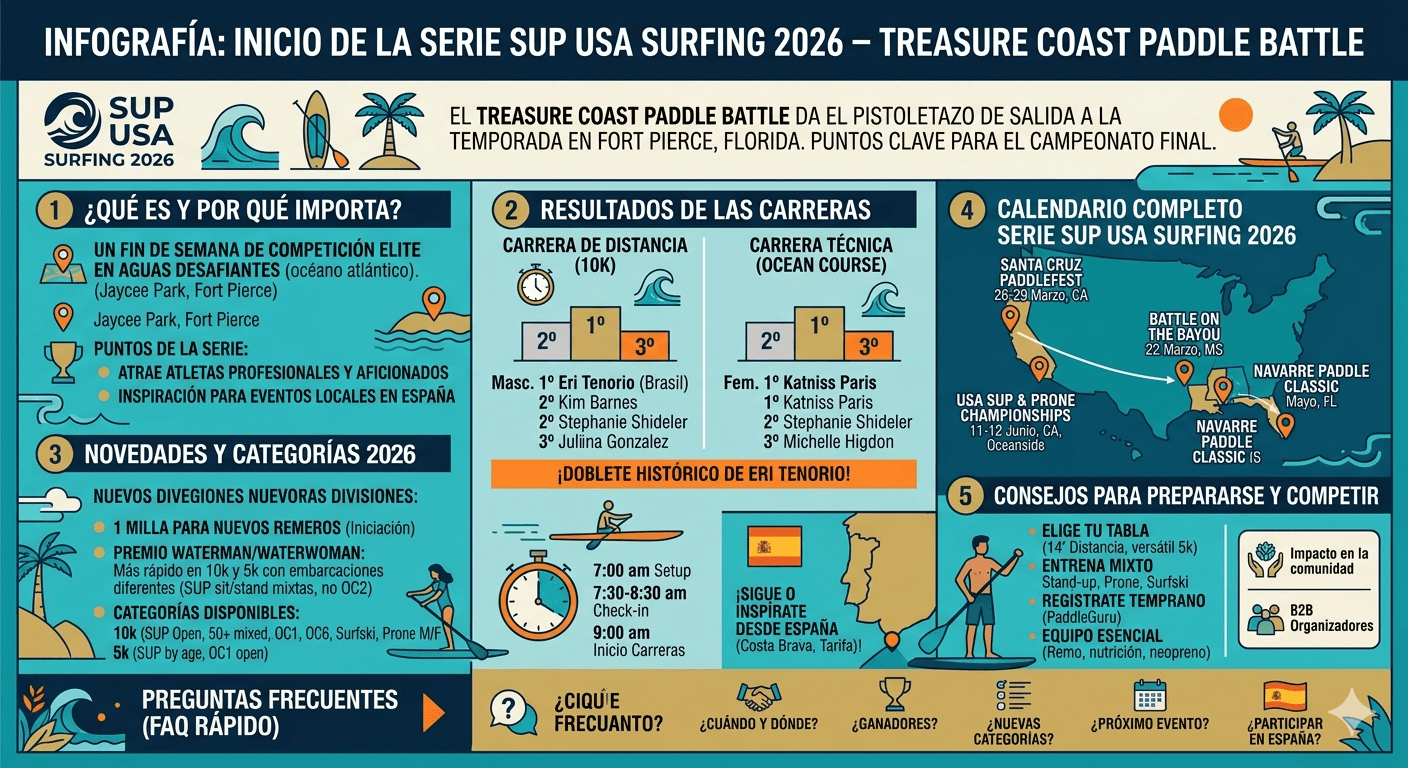El Treasure Coast Paddle Battle ha abierto la temporada de la Serie de Carreras SUP USA Surfing 2026 con una vibrante competición en Fort Pierce, Florida. Este evento reúne a remeros de élite en pruebas de distancia y técnica, marcando el inicio de un calendario emocionante que culmina en junio.